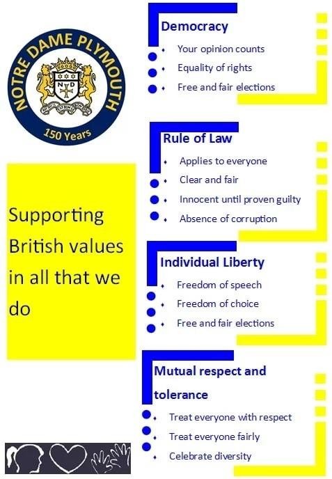 At Notre Dame we recognise and promote our Great British Values of democracy, the rule of law, individual liberty, mutual respect for and tolerance of those with different faiths and beliefs and those with no faith.